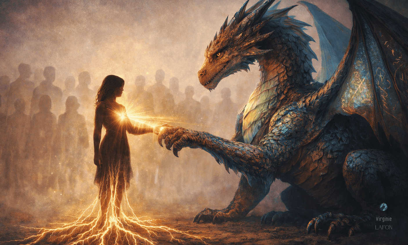Les dragons interviennent ici comme des soutiens énergétiques. Ils créent un espace sécurisé et stable, propice à ce travail en profondeur.