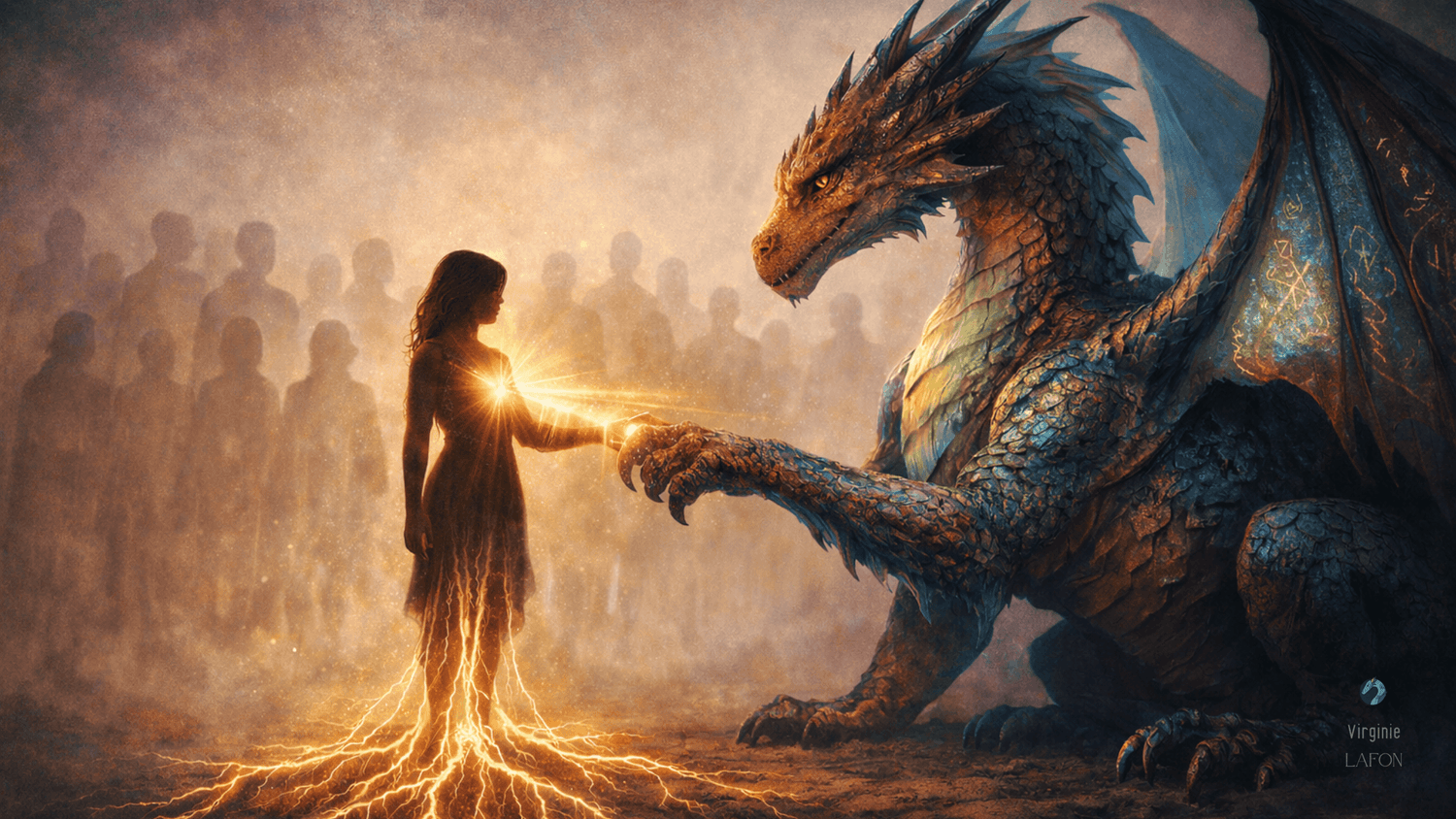 Avec l’aide des dragons, vous êtes guidé·e dans un espace sécurisé pour apaiser, remercier et réharmoniser votre lignée.